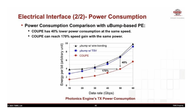 SoIC 以混合鍵合方式銅對銅直接做晶片間的連接,SoIC-X 省去凸塊(bumpless)讓晶片之間連接更緊密。根據台積電數據,相較於微凸塊(uBump)技術,混合鍵合在相同速度下可降低 40% 功耗,或在相同功耗下達到 170% 速度提升。
