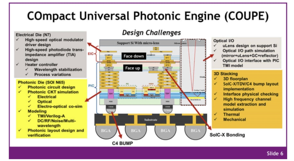 COUPE 同時包含完整的製程設計套件(PDK),支援光子電路設計、電光協同模擬與多波長建模,包含光學介面也發展出垂直的光柵耦合(Grating Coupler, GC)與水平的邊緣耦合(Edging Coupler, EC)兩種解決方案,來提升與光纖陣列模組(FAU)的光耦合效率。