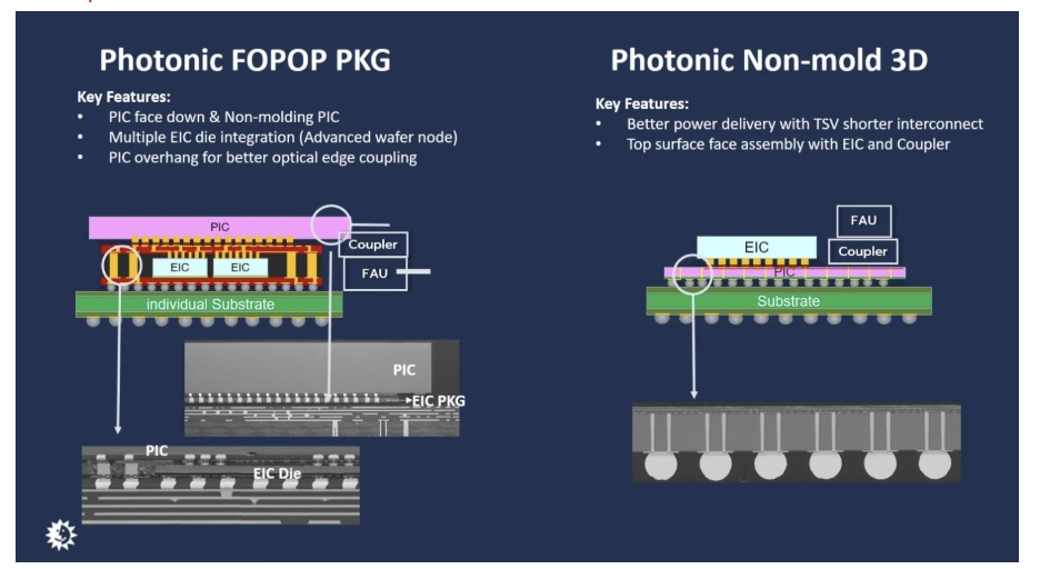 Non-mold 3D 主要將 PIC 置於下方,並使用 PIC 形成的 TSV 與放上方的 EIC 進行垂直互連,PIC 上方、EIC 旁邊整合耦合器(coupler)與光纖陣列模組(FAU)與外部光纖光源耦合。FOPoP 方案則將 PIC 置於 EIC 上方,再利用扇出區以銅柱互連,而銅柱間懸空的部分允許邊緣耦合(Edging Coupler, EC)。日月光整合於 VIPack 平台的 FOPoP 技術,可將電氣路徑減少 3 倍,頻寬密度提高 8 倍,使引擎頻寬擴展每單位達到 6.4 Tbps。