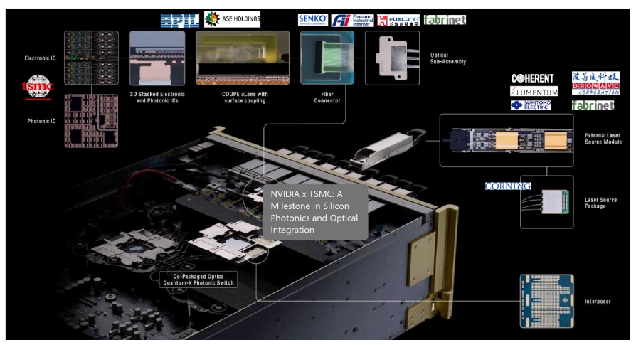 從 Quantum-X800 供應鏈拆解來看,EIC 與 PIC 光學引擎由台積電 COUPE 整合,再由日月光/矽品進行後段封裝,涵蓋關鍵的光學介面耦合與光纖對準。