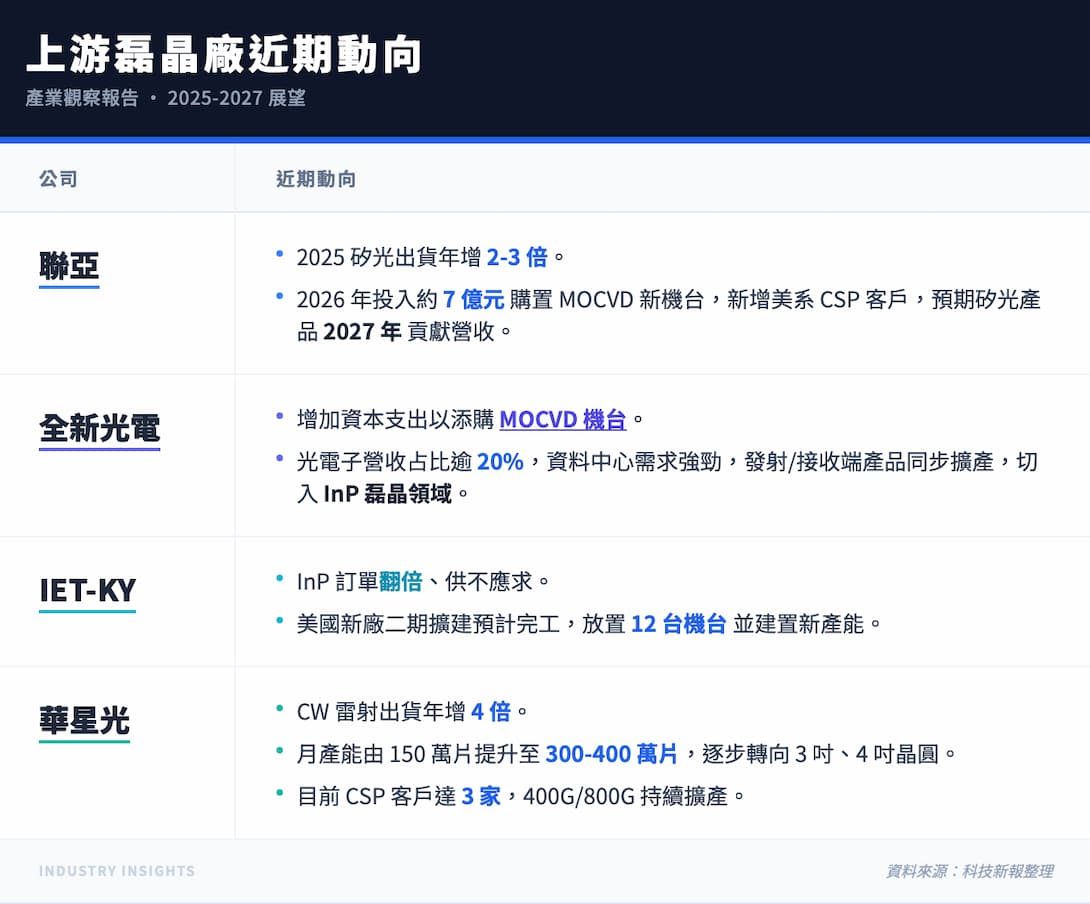 光通訊 InP 磊晶廠聯亞在最新法說會中提到,2025 年矽光產品出貨量已年成長 23 倍以上,盼 2026 年出貨目標維持此高成長幅度。此外,在市場需求擴張下,聯亞 2026 年將投入約 7 億元的資本支出,用於購置 MOCVD 新機台,先以矽光產品出貨為主,預期 2027 年開始貢獻營收。