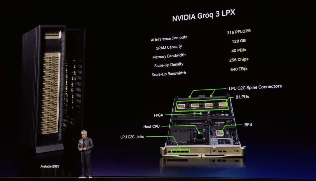 這次主題演講中,另一個值得注意的便是專容納 Groq 新型加速器的「Groq 3 LPX」,這是專為低延遲和大型情境需求所設計,該機架可容納 256 顆 LPU,並擁有 128GB 晶片內 SRAM 及 640 TB/s 的擴展頻寬。透過 LPX 與 Vera Rubin 結合,可使每兆瓦的推論資料輸送量最高可提升 35 倍,同時創造出多達 10 倍的營收機會。LP30 晶片採用三星 4 奈米製程,預期第三季開始出貨,下一代 LP35 預期也會由三星操刀。