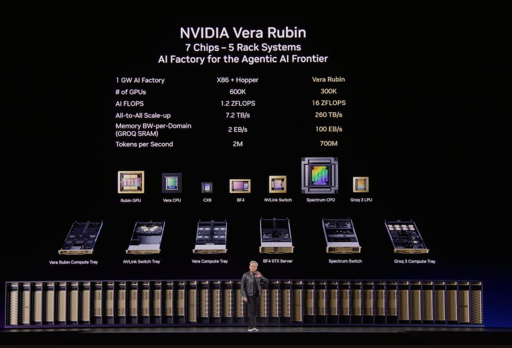 執行長黃仁勳指出,Vera Rubin 代表跨世代的躍進,七款突破性晶片、五組機架、一台巨型超級電腦,旨在驅動 AI 的每一個階段。這些晶片目標透過協同運作來組成一台強大的 AI 超級電腦,驅動 AI 的各個階段,從大規模預訓練、後訓練、測試階段擴展,到即時的代理型推論皆涵蓋其中。