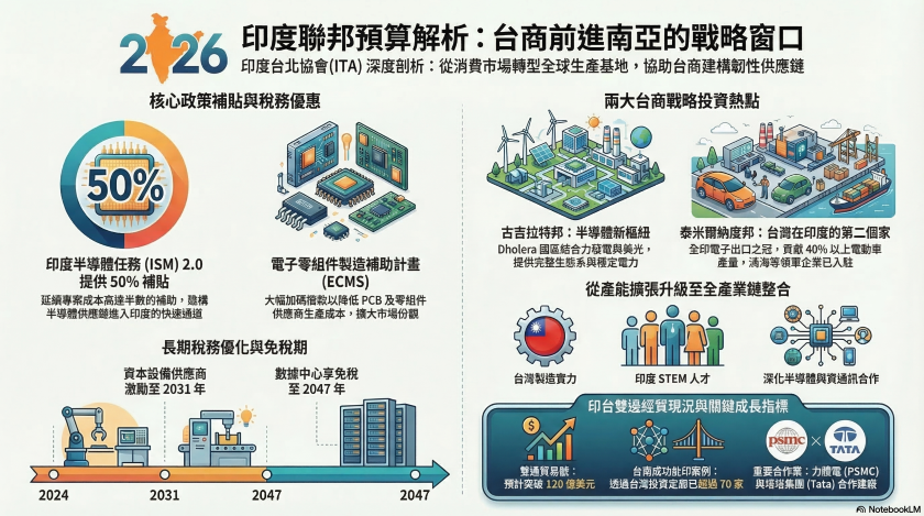 - 印度半導體任務 (ISM) 2.0:政府已啟動旗艦級計畫的新階段,強化對本土設備、材料及自有 IP 設計的支持。延續 ISM 1.0 對專案成本高達 50% 的補貼力度,這將為台灣半導體供應鏈(含設備、封測、晶圓代工等)建構進入印度的「快速通道」。
