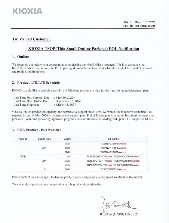 針對產品的最後採購和出貨時間,鎧俠指出,最後採購預測(即客戶最後一次下單數量)期限為 2026 年 5 月 30 日,最後採購訂單截止日為 2026 年 9 月 15 日,最後出貨時間為 2027 年 3 月 15 日。
