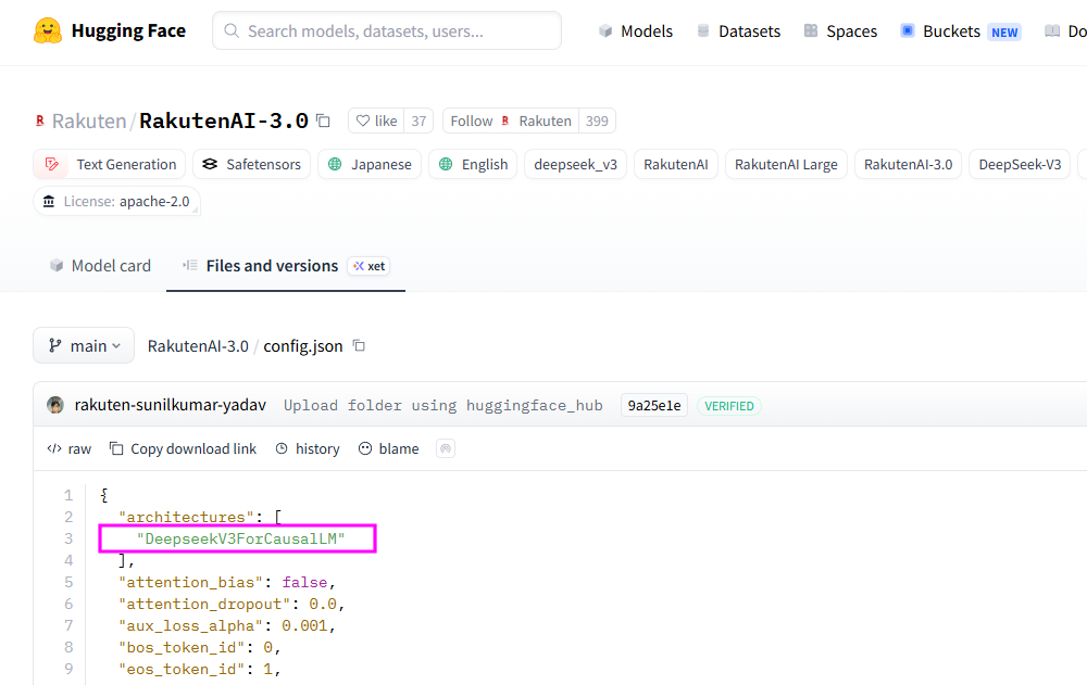 在知名的AI開源程式庫Hugging Face上,Rakuten AI 3.0赫然在自己的設定檔裡面寫著架構來自DeepSeek V3。