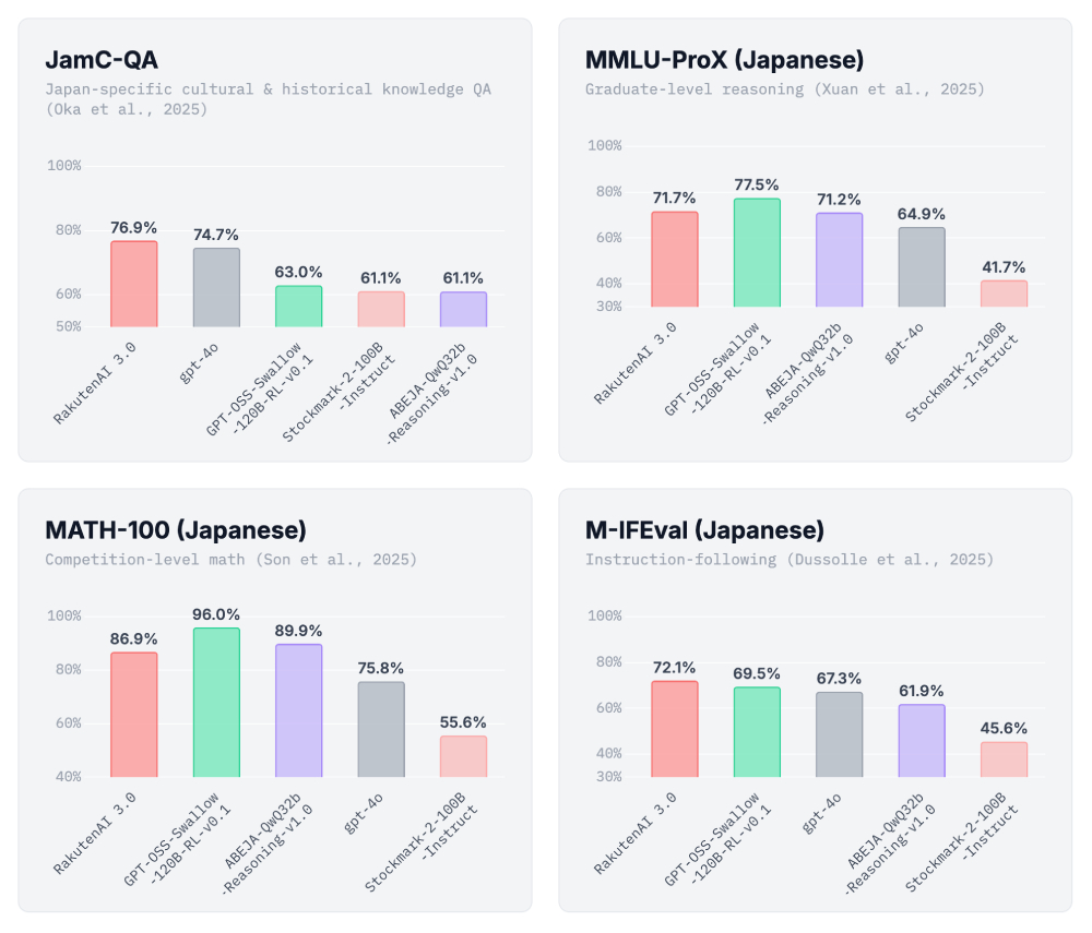 關於Rakuten AI 3.0的模型表現,在官方公布的各項基準測試中,它在日語文化知識、歷史、研究生水平推理、甚至競技數學和指令遵循等維度上,得分表現都極其優異,大有橫掃日本本土大模型圈的架勢。