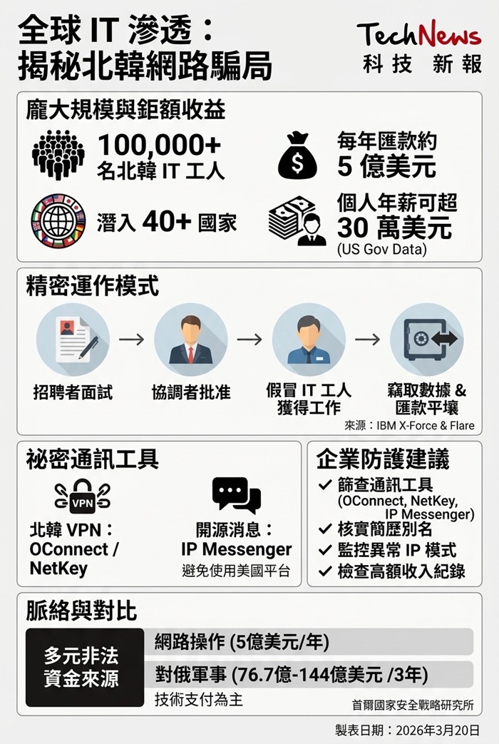 這一IT詐騙計畫是平壤多元化非法資金來源的一部分,僅網路操作每年就能帶來至少5億美元的收入,支持其軍事擴張。此外,根據首爾國家安全戰略研究所的報告,從2023年到2025年,北韓向俄羅斯的武器銷售和部隊部署總共產生了76.7億至144億美元的收入,這些大多數以軍事技術而非現金支付。