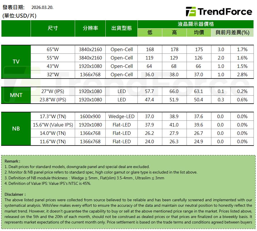 ▲ TrendForce 3 月下旬最新面板報價。(Source:TrendForce)