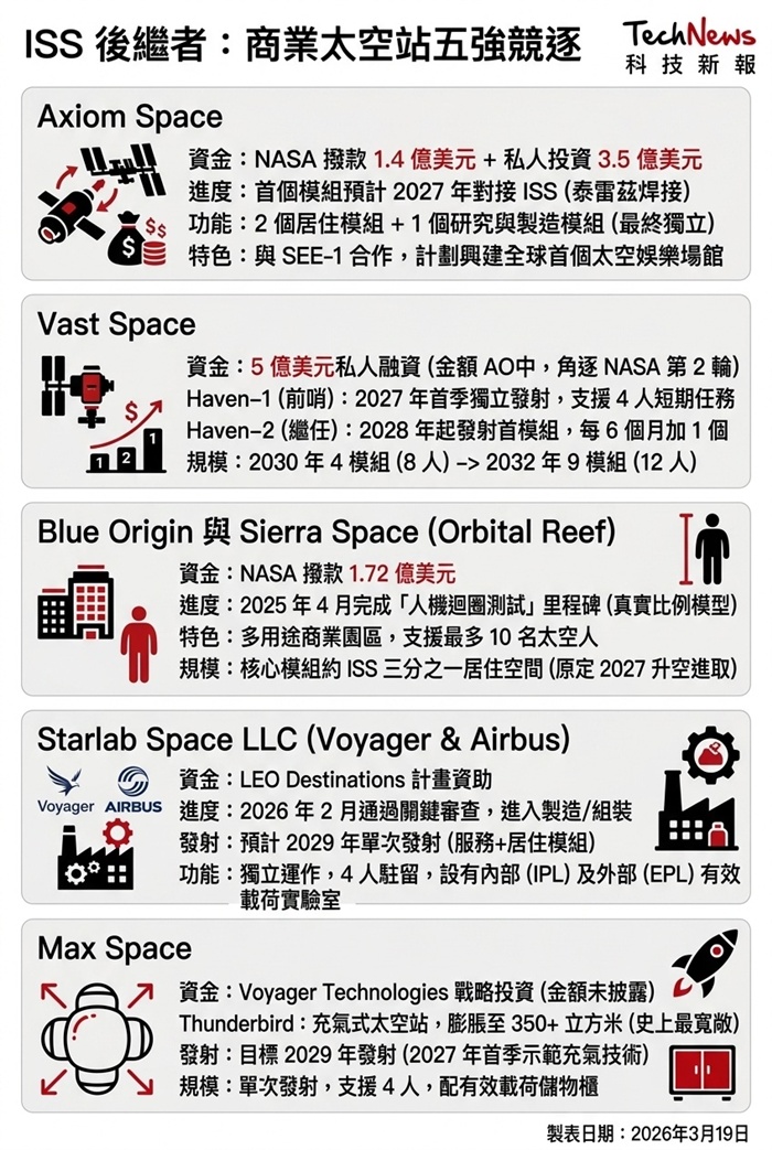 隨著 ISS 退役倒計時進入最後數年,多個商業太空站項目正加速推進。從 2027 年 Axiom Station 及 Haven-1,到 2029 年 Starlab 及 Thunderbird,料將有多個站體在近十年相繼升空,開創商業太空基礎設施新時代。然而技術挑戰、持續融資能力,以及 NASA 第 2 輪合約競爭結果,將是決定各項目命運關鍵。預料未來數年各公司將陸續公布更多融資進展及研發里程碑,業界動向值得密切追蹤。