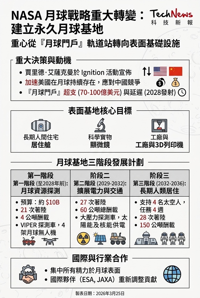 在3 月 24 日的「Ignition」活動中,美國國家航空暨太空總署(NASA)署長賈里德·艾薩克曼(Jared Isaacman)宣布一項重大計畫,將重心從建設月球軌道的「月球門戶」(Lunar Gateway)轉向在月球表面建立一個永久基地。該決策是基於對資源的重新分配,旨在加速美國在月球的持續存在,以應對來自中國的競爭壓力。
