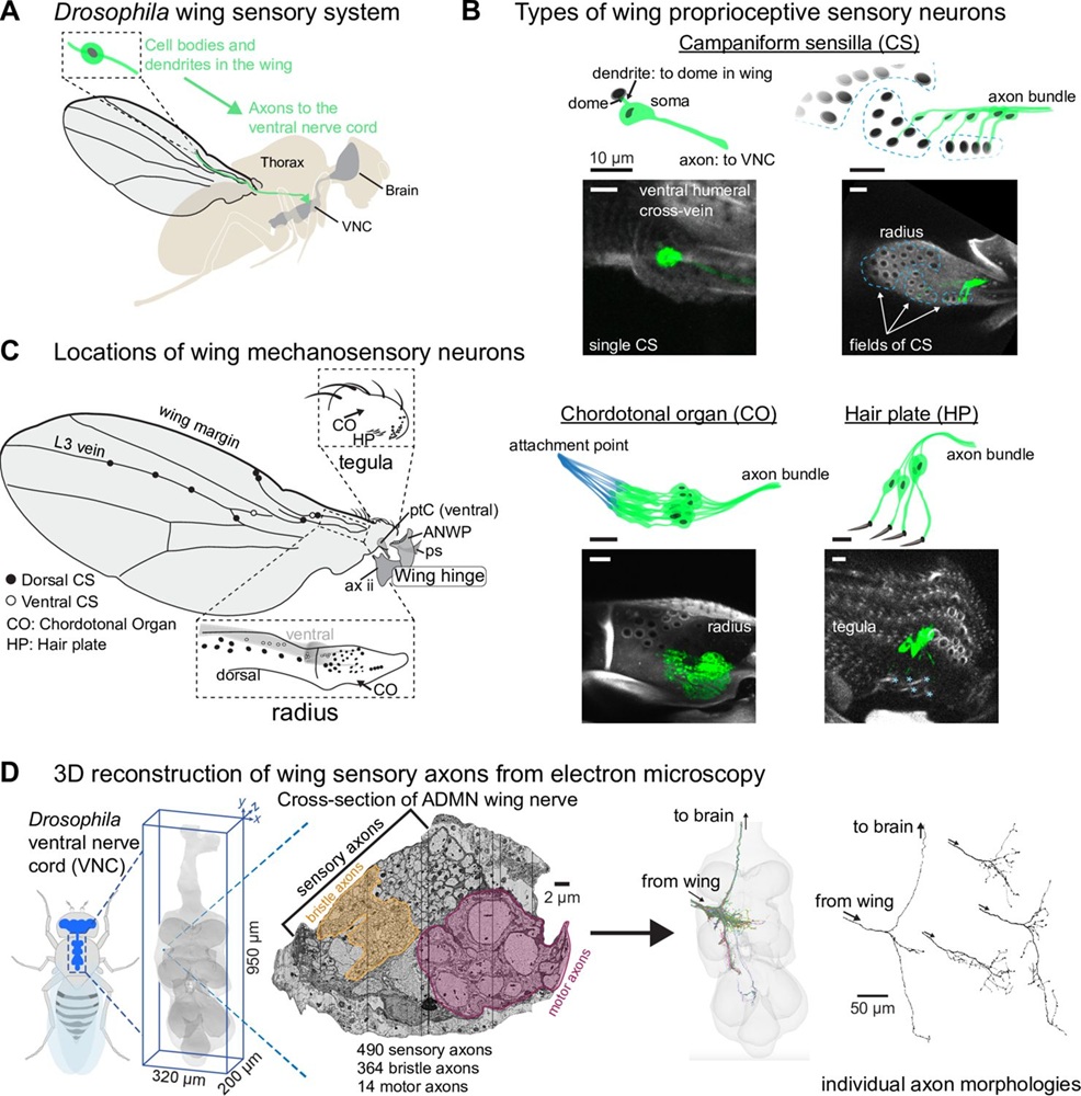 團隊利用電子顯微鏡影像,建立果蠅翅膀神經系統的詳細結構圖及整體神經連線。結果顯示,一條主要翅膀神經就含約490條感覺神經軸突!研究員還辨識出不同類型感覺器(sensilla),能偵測翅膀變形、振動、接觸或氣流。這些結構共同形成一套高度精細的感測系統,隨時監控翅膀的力學狀態。