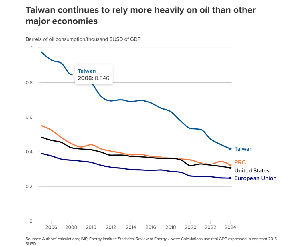 報告首先點出台灣在能源結構上極度缺乏自主性的問題。數據顯示,在2025年,台灣高達95%的能源需求仰賴進口,其中石油與天然氣的進口依賴度更超過99%。在本次中東戰爭爆發前,台灣每年有超過38%的天然氣供應以及約70%的原油必須仰賴中東地區進口。儘管在過去20年來,隨著全球趨勢發展、能源效率提升,以及服務業與半導體產業的擴張使得高耗能石化產業比重下降,台灣經濟對石油的依賴度已顯著降低。然而,與其他主要經濟體相比,台灣仍屬於高度石油密集型經濟,這使得台灣在面對國際石油供應衝擊時顯得更為脆弱。長遠來看,隨著半導體占台灣國內生產毛額(GDP)的比例不斷增加,石油密集度預期將會持續下降。
