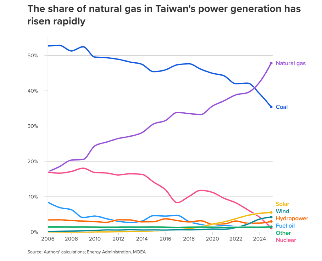 然而,在石油依賴度下降的同時,台灣卻在電力結構上轉而重度依賴另一種進口能源-天然氣。根據統計,天然氣在台灣發電量中的占比,已從2006年的約17%大幅飆升至2025年的將近48%。報告直指,這一快速增長主要歸因於執政黨為減少煤炭使用並達成「全面廢除核能」的政策目標,而該非核家園目標已於2025年5月正式實現。