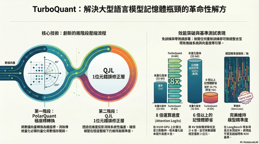 外媒報導,Google 研究團隊於日前正式發表了一項名為「TurboQuant」的全新免訓練(training-free)壓縮演算法。這項革命性的技術能夠將大型語言模型的鍵值快取(KV caches)大幅壓縮至僅剩 3 位元(3 bits),且過程完全不會造成模型準確度的損失。