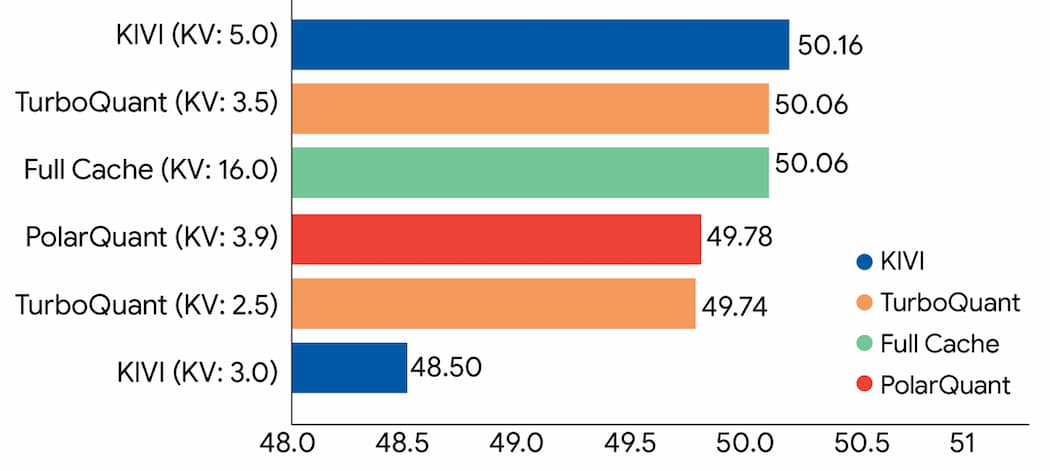 Google 也分享 TurboQuantPolarQuant 以及基準方法 KIVI 在問答、程式碼生成與摘要等不同任務中的綜合效能表現。