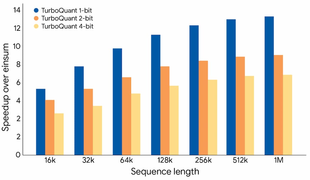 接著,Google 也展示了使用 TurboQuant 計算注意力對數(attention logits)時所獲得的加速效果。直接從結果來看,在 H100 GPU 加速器上,4 位元 TurboQuant4-bit TurboQuant,即淡黃色直線)相較於 32 位元未量化鍵值,性能提升最高可達 8 倍。
