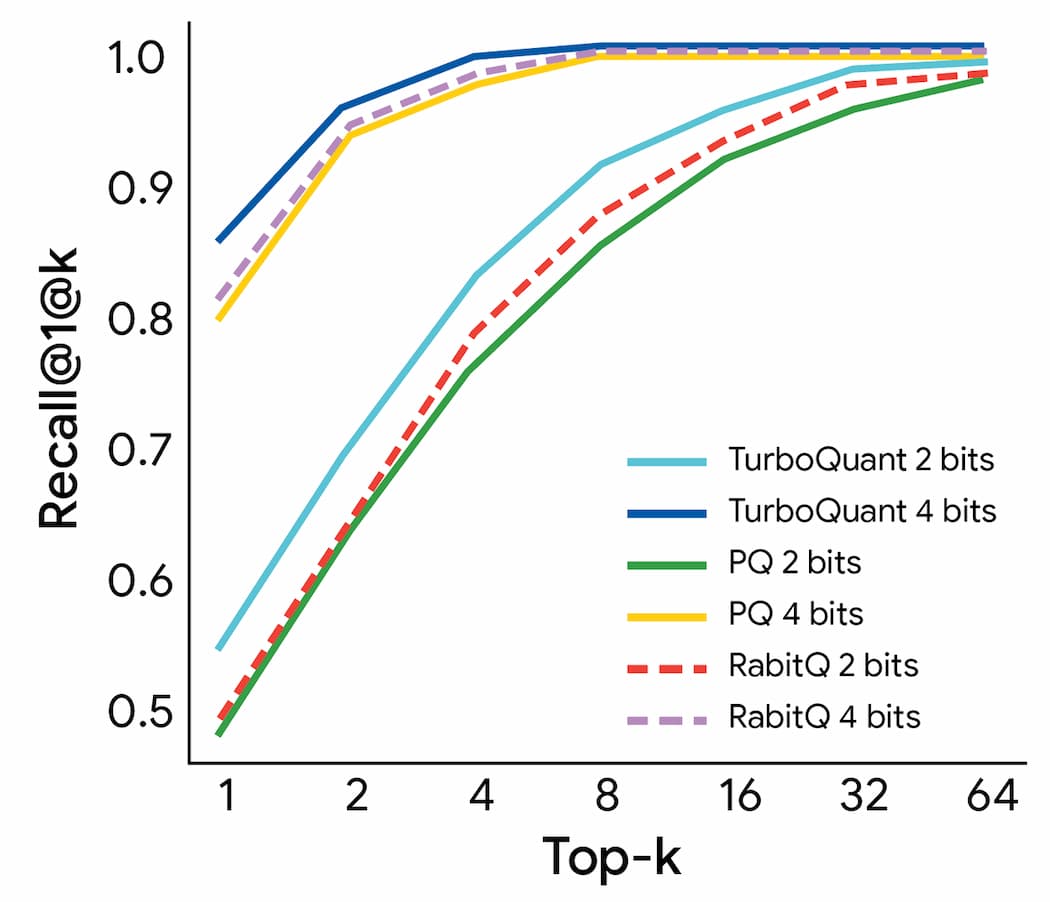 接著,Google 也將 TurboQuant 與目前最先進的方法 PQRabbiQ 進行比較,確認在高維向量搜尋任務中、使用 1@k 召回率的結果。最後發現,TurboQuant 仍持續更優異的召回率,也驗這了其在高維搜尋任務中的穩健性與效率。