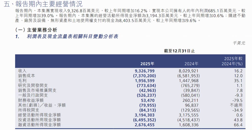 中芯國際 26 日公布 2025 年財報,營收為 93.27 億美元、年增16.2%,毛利率 21%,淨利潤 6.85 億美元、年增 39%,雙創歷史新高;產能利用率升至 93.5%,公司預期 2026 年營收增幅將高於可比同業平均值,資本支出與 2025 年大致持平。