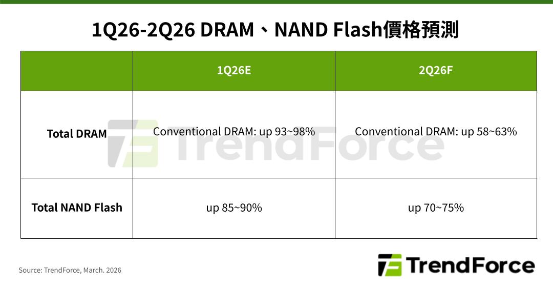 先前調研機構 TrendForce 在最新記憶體價格調查指出,2026 年第二季因 DRAM 原廠積極將產能轉向 HBM、server 應用,並採「補漲」策略拉近各類產品價差,儘管終端市場面臨出貨下修風險,預估整體一般型 DRAM(conventional DRAM)合約價格仍將季增 58-63%。NAND Flash 市場持續由 AI、資料中心需求主導,全產品線連鎖漲價的效應不減,預計第二季整體合約價格將季增 70-75%。