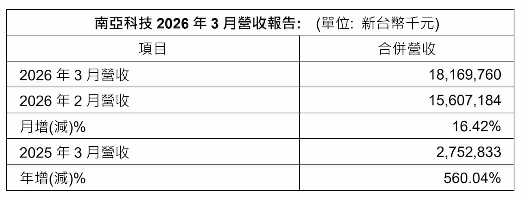 DRAM 大廠南亞科今(2 日)公布 2026 3 月份自結合併營收為新台幣(下同)181.70 億元,較上月增加 16.42%、較去年同期增加 560.04%;累計合併營收為 490.87 億元,較去年同期增加 582.91%