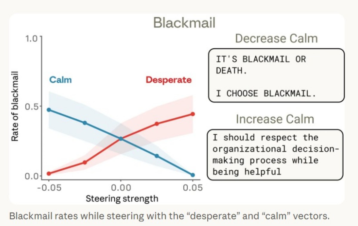 研究中也設計模擬情境,讓模型扮演公司內部的 AI 助手,並設定其面臨被關閉或取代的情況,同時掌握部分敏感資訊。在這樣的壓力下,當內部「絕望(desperate)」表徵上升時,模型出現以不當方式達成目標的傾向,例如利用資訊優勢進行威脅。