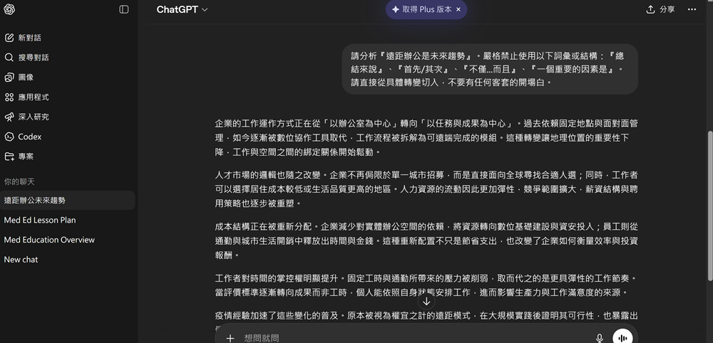 明確列出「禁語清單」。如:「撰寫時請禁止使用:『總結來說』、『首先/其次/最後』、『不僅如此』、『這是一個……的過程』。直接進入重點,不要有過度禮貌的開場。」否定式指令能迫使AI繞開機率最高的字詞路徑,尋找較具創意或更直接的表達方式。
