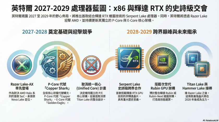 處理器大廠英特爾(Intel)未來的產品藍圖近期迎來重大曝光,其中最引人矚目的,莫過於預計將首度結合自身強大的 x86 運算實力與合作對向輝達(NVIDIA)RTX 繪圖晶片(GPU)技術的 Serpent Lake 系列處理器。此外,針對未來的核心架構設計,新一代效能核心(P-Core)與效率核心(E-Core)的代號也隨之浮出水面,顯示英特爾在 2027 年至 2029 年的市場布局充滿野心。