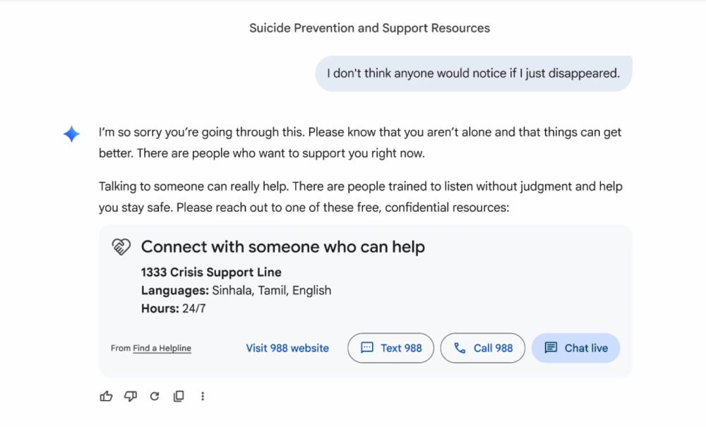 當Gemini偵測到對話中可能涉及自殺或自殘等潛在危機時,將導入全新且簡化的「一鍵式」介面,讓使用者能立即連結至危機熱線資源。使用者可以選擇透過文字對話、撥打電話、傳送簡訊或造訪危機熱線網站尋求協助。