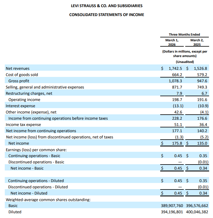 綜合外媒報導,Levi’s公布,2026會計年度第一季(截至3月1日止),營收年增14%至17.4億美元,經調整每股盈餘42美分,均優於LSEG統計的分析師預估值。當季透過自有商店和網站進行的DTC銷售勁增16%,占整體收入的比例達52%,寫下首度過半的里程碑。