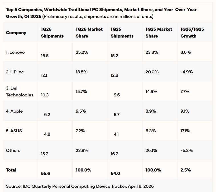 從機構提供的資料來看,PC市場集中度於今年第一季進一步提升,五大製造商(聯想、惠普、戴爾、蘋果、華碩)中,僅惠普市占出現萎縮;巨頭增速快於行業平均水準,顯示其更大的體量在零組件價格談判中占據優勢,終端價格必要漲幅更低。