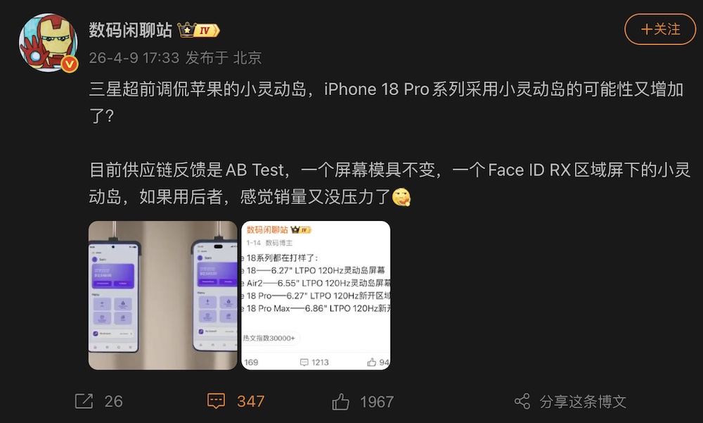 據微博爆料帳號「數碼閒聊站」的最新說法,iPhone 18 Pro 的動態島目前仍處於 A/B 測試階段。供應鏈回饋顯示,其中一套方案是沿用現有螢幕模具,另一套則是導入更小的動態島設計,並把部分 Face ID 的 RX 元件移到螢幕下方。