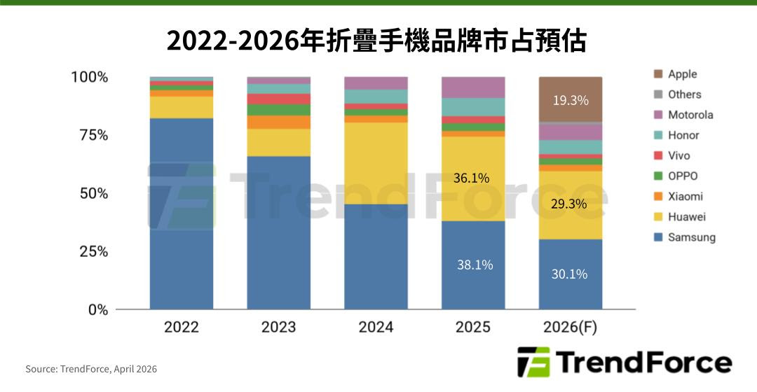 TrendForce預估,蘋果憑藉品牌形象與消費者的期待,將於今年取得摺疊手機市場近20%市占,並壓縮競爭對手三星、華為占比至30%上下。