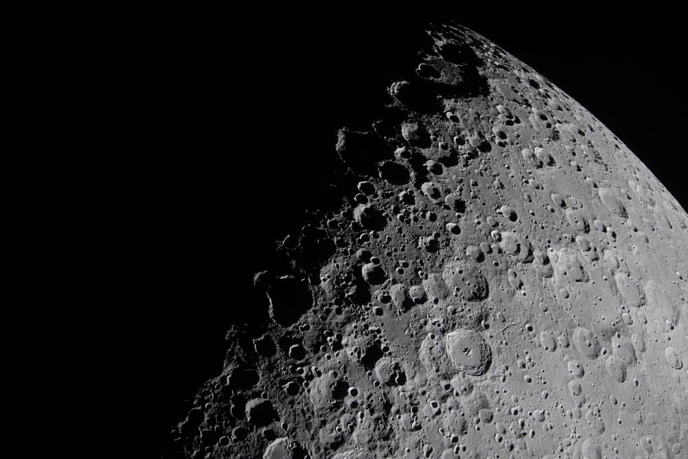4月6日,太空人在繞月球背面飛行的約三小時後拍攝的月球晨昏線照片。低角度的陽光在月球表面投下長長的、引人注目的陰影。這種掠射光突顯了月球崎嶇的地形,使隕石坑、山脊和盆地等結構清晰可見。晨昏線附近的伯克霍夫隕石坑與斯特賓斯隕石坑以及周圍的高地特徵尤其明顯。從這個角度來看,光影的交錯展現了月球表面的複雜性,這是在完全光照下無法看見的景象。