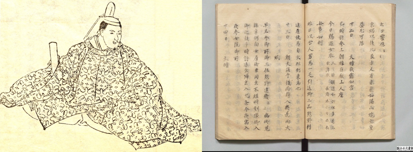 ▲ 左為藤原定家江戶時代插圖。右為藤原定家江戶時代手抄的日記《明月記》,頁面右側有「北方天空的紅光」記載。(Source:National Archives of Japan (Public domain))