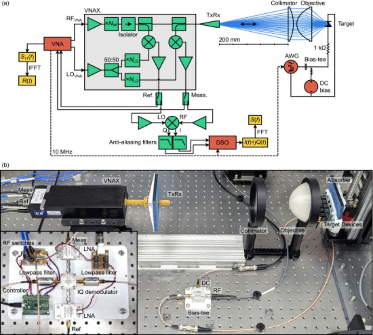 相較之下,該研究提出的太赫茲量測技術,透過電磁波與晶片交互作用來推測電晶體活動。其原理為利用向量網路分析儀(VNA)產生微波訊號,經頻率轉換後形成太赫茲波,並照射至晶片表面。