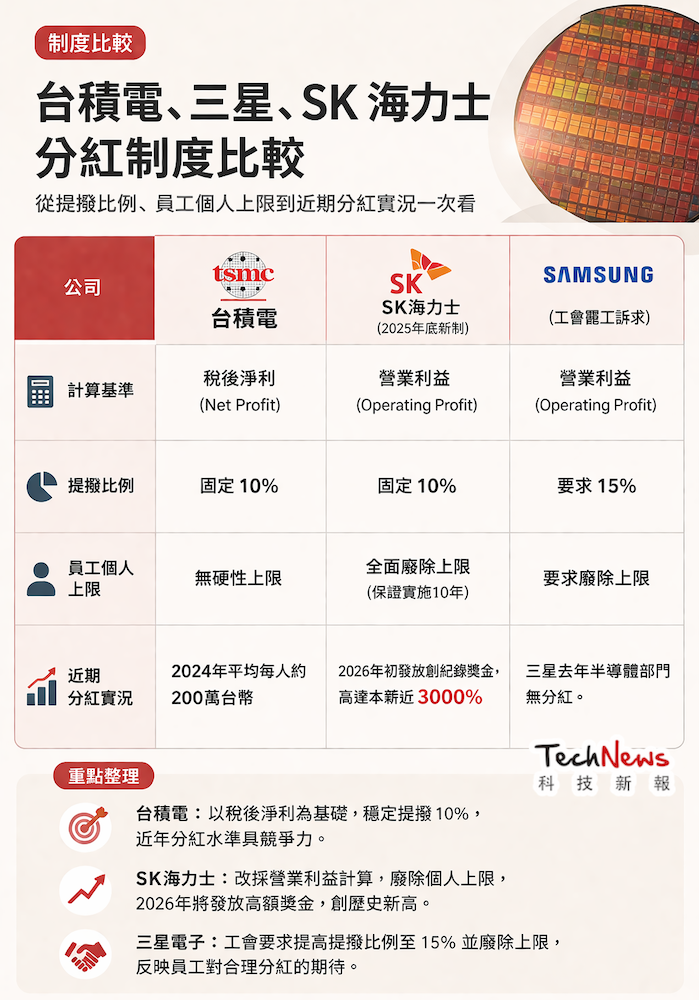 根據 SK 海力士最新的勞資制度(2025 年),是以營業利益為計算標準,即將營業利潤的10%直接用於員工獎金(PS),取消上限,使獎金極大化。這也意味著,只要本業賺錢,即使公司砸大錢蓋廠買設備,員工紅利也絕對不會縮水;相比之下,三星現階段的制度則在計算績效獎金時,需先扣除資本成本和稅金。