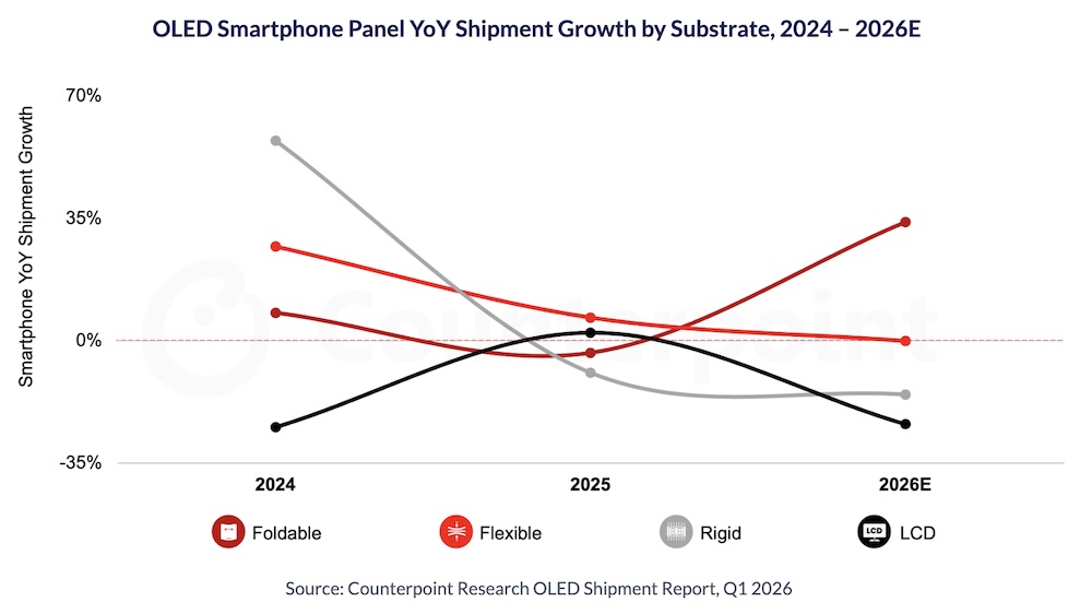 記憶體與零組件成本持續墊高,正讓 OLED 面板市場的成長動能出現分化。據調研機構 Counterpoint Research 最新 OLED 出貨報告,全球 OLED 面板出貨量在 2026 年預估將與前一年持平,相較 2025 年仍有 3% 年增,整體成長明顯放緩,主因就在於智慧手機 OLED 面板需求轉弱。