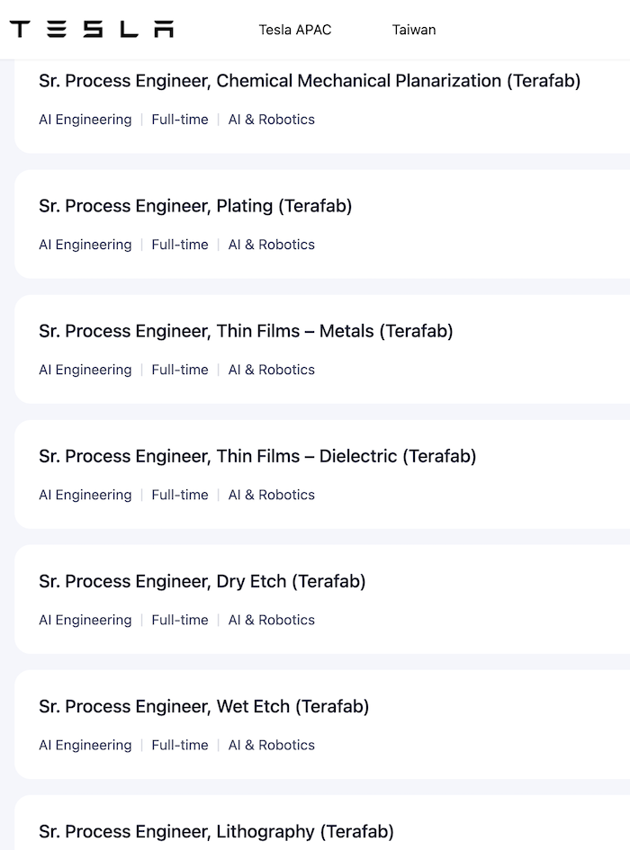根據特斯拉官方網站釋出的最新職缺資訊,特斯拉正積極在台灣新竹市招募半導體工程師,且開出的九大類職缺全數為「資深」等級的製程核心工程師。這九大職缺涵蓋了晶圓製造前段製程的各個關鍵環節,包括資深化學機械平坦化(CMP)製程工程師、資深電鍍製程工程師、資深薄膜-金屬製程工程師、資深薄膜-介電質製程工程師、資深乾蝕刻製程工程師、資深濕蝕刻製程工程師、資深微影製程工程師、資深良率與量測工程師,以及資深製程整合工程師。