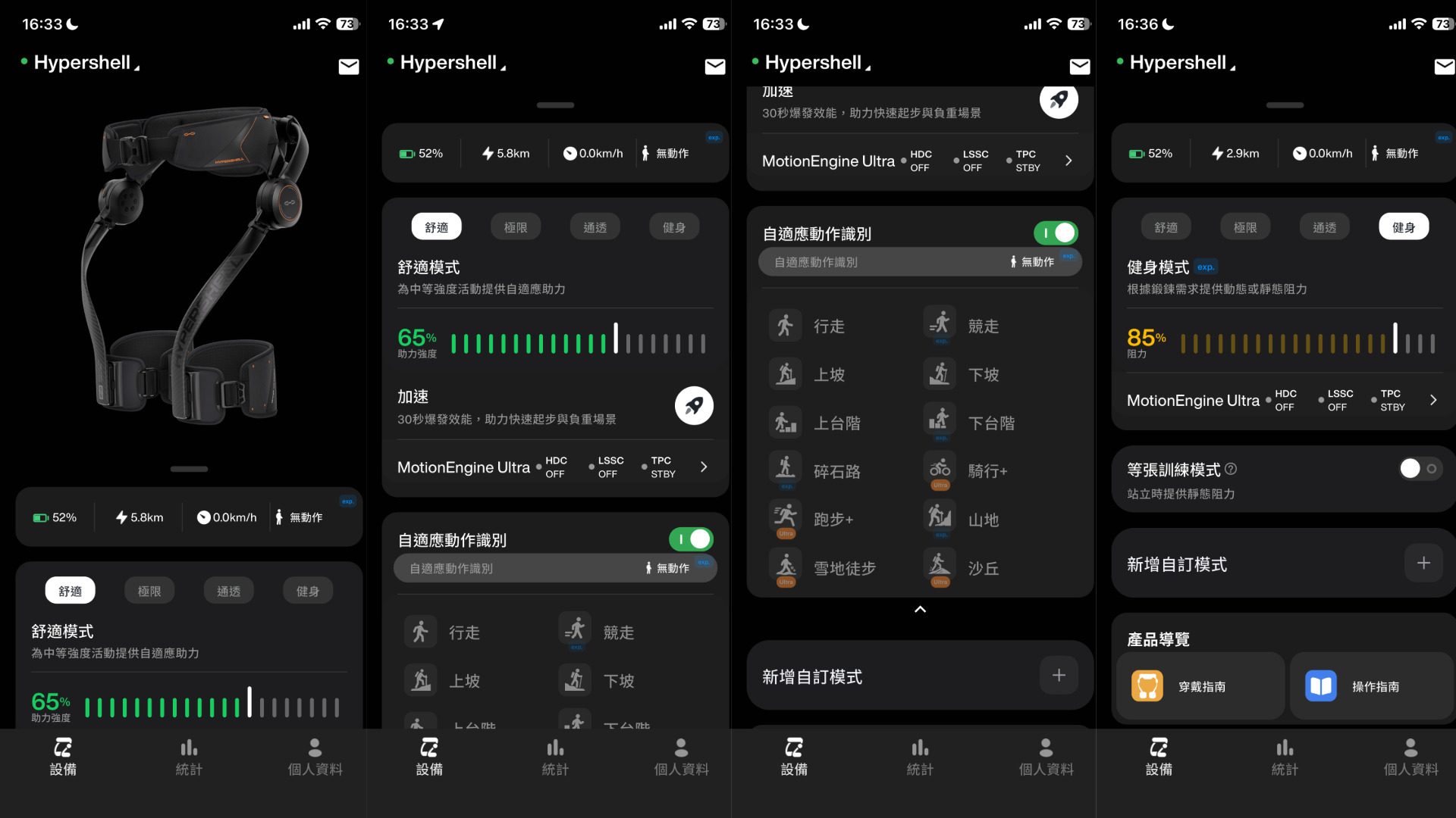 在 App 中有四種模式可以選擇,舒適、極限、通透和健身,而下方則是可以在四種模式下調整機器的出力程度。