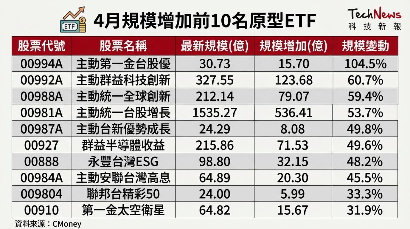 從規模來看,根據 Cmoney 統計,規模成長率第一名為主動第一金台股優(00994A),4 月規模翻倍,成長率達 104.5%;規模增加金額第一名為主動統一台股增長,4 月規模增加 536.41 億元,成長率達 53.7%。