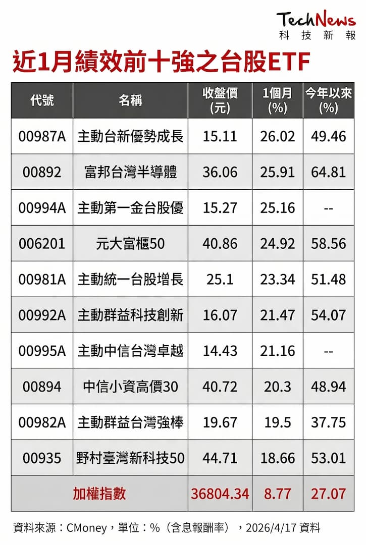 美伊戰爭現轉機,帶動台股加權指數今日站穩 37,000 點之上,帶動台股 ETF 股價飆漲,統計近一月績效前十強台股 ETF 報酬率皆逾 18%,皆為加權指數ㄧ倍以上,績效前三強更皆大漲逾 25%,至於台股 ETF 規模加速飆增逾 7,000 億元,最新規模達 8.9 兆元。
