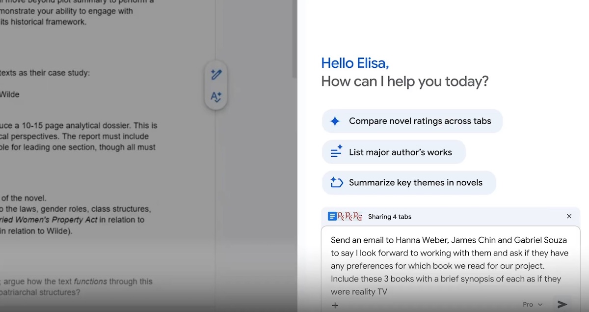 Chrome 中的 Gemini 能夠跨越多個分頁進行交叉比對,並將資訊統整在同一畫面中。Google 舉例,如果正在規劃公司的團康活動,Chrome 能彙整所有搜尋到的資料,幫你規劃出完美的破冰行程;或者挑選純素高蛋白粉時,Gemini 可建立表格,清楚比較不同網站上的商品細節,讓購物決策更加輕鬆。