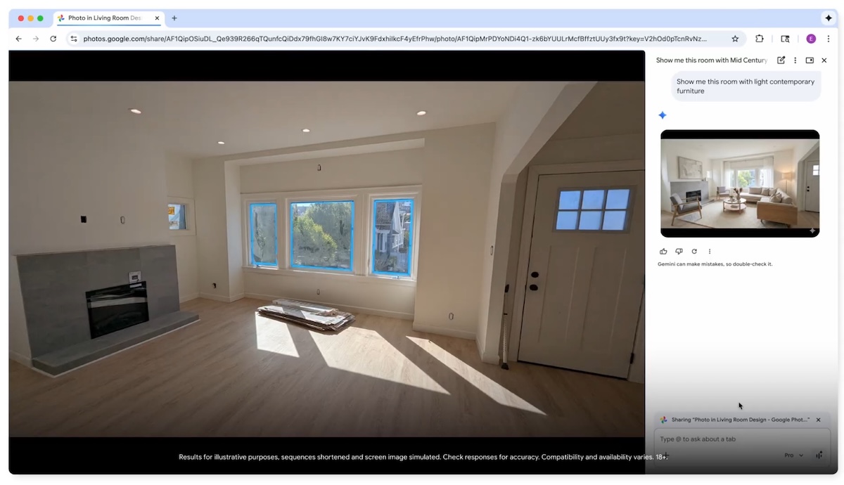 Google 也將 Nano Banana 2 的模型直接內建在 Chrome,只要在側邊欄用文字描述想像中的畫面,Nano Banana 2 可以直接調整圖片,不需要額外上傳檔案或開啟新分頁。Google 舉例,你可以化身為室內設計師,在購買家具前,先在網頁上模擬擺放在家中的布置效果。
