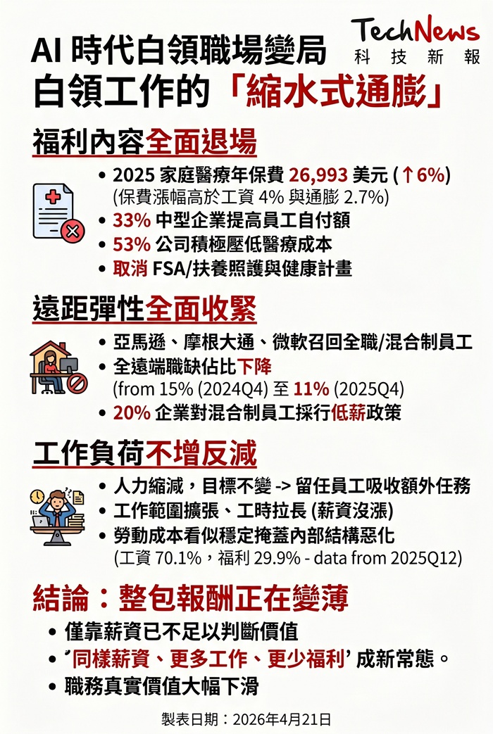 在 AI 加速重塑白領工作的背景下,表面上看起來穩定的薪資,可能掩蓋了整體職務價值的下滑。多項最新調查顯示,雇主正在從健康保險、彈性支出帳戶到居家辦公彈性,逐步削減白領工作原本具備的非薪資報酬,甚至在不加薪的情況下,把更多工作量壓到留任員工身上。