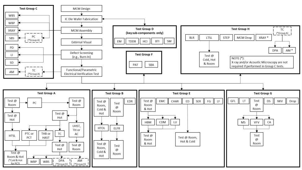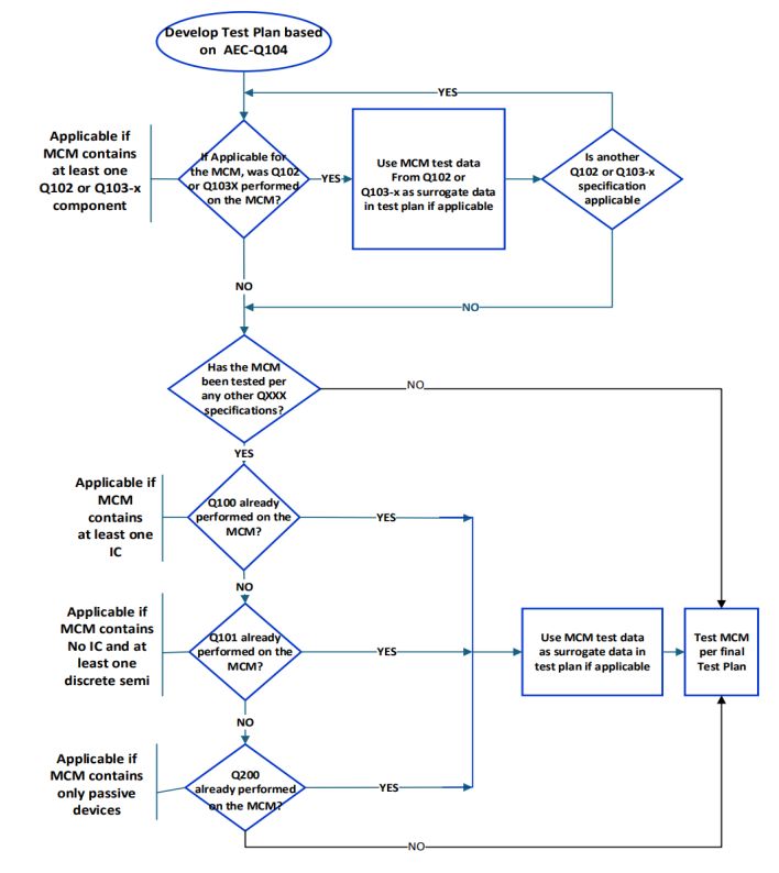 AEC 更新 Qualification Flow(驗證流程),AEC 更新整體 MCM Qualification Flow,納入更完整的 MCM 決策流程(Decision Flow),並新增「基於功能用途」的測試選項與AEC Q100/Q101/Q102/Q103x 的流程邏輯統一化。AEC‑Q104 將測試分為 A~H 八大類,共 49 個測試項目。