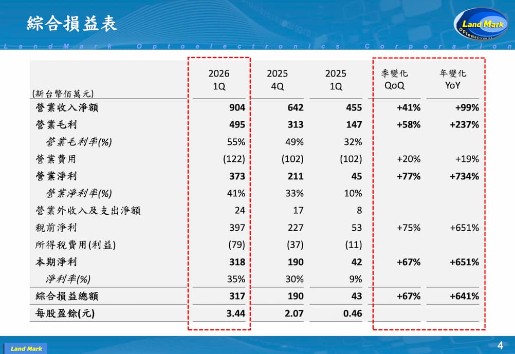 受惠 AI 資料中心帶動矽光子(SiPh)高速傳輸需求,聯亞 2026 年第一季營收為 9.04 億元,年增近 99%;稅後淨利為 3.18 億元,每股盈餘 3.44 元。展望第二季,聯亞預期營收成長幅度將與 2025 年第四季相當、甚至更佳。