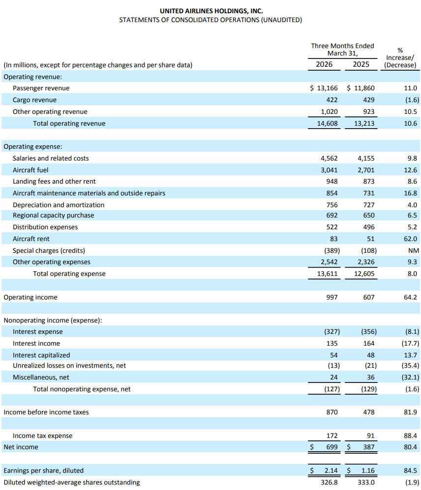 CNBC等外媒報導,聯合航空21日公布2026年第一季財報,營收年增10.6%至146.1億美元,優於LSEG調查所預期的143.7億美元;淨利達6.99億美元,較去年同期激增80%;若排除一次性收益,調整後每股盈餘為1.19美元,同樣優於LSEG共識預期的1.07美元。