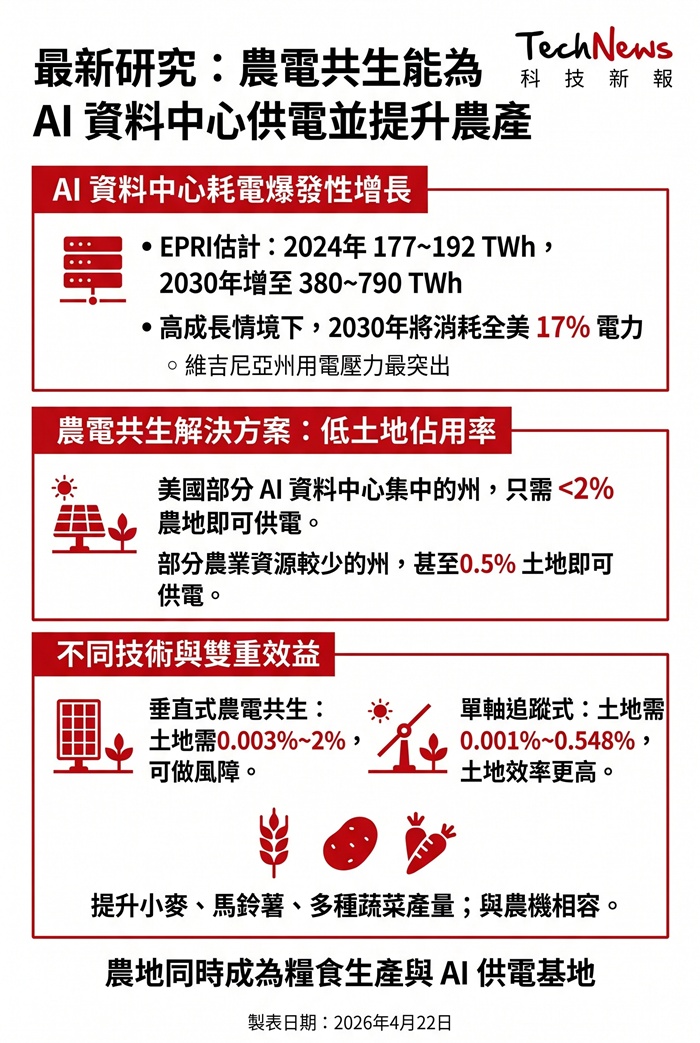 根據最新研究,若善用農電共生(agrivoltaics),美國部分擁有大型 AI 資料中心的州,可能只需動用不到 2% 的農地,就能為資料中心供應所需電力,並有機會提升農作產量。這項分析正值外界愈來愈擔心 AI 帶動的耗電快速攀升之際;研究也指出,資料中心用電可能持續增加,電網壓力與供電規劃已成為 AI 擴張的核心難題。