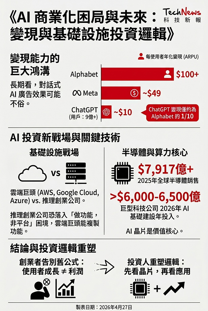 整體而言,這門公開課把 AI 的投資邏輯重新定義為「先看晶片,再看應用」。對創業者來說,Agrawal 提醒不能再沿用「使用者成長,利潤自然跟上」的軟體舊公式;對投資人而言,短期仍是晶片與算力占優勢,長期則取決於誰能率先找到足以對標 Alphabet 與 Meta 的 AI 變現模式。